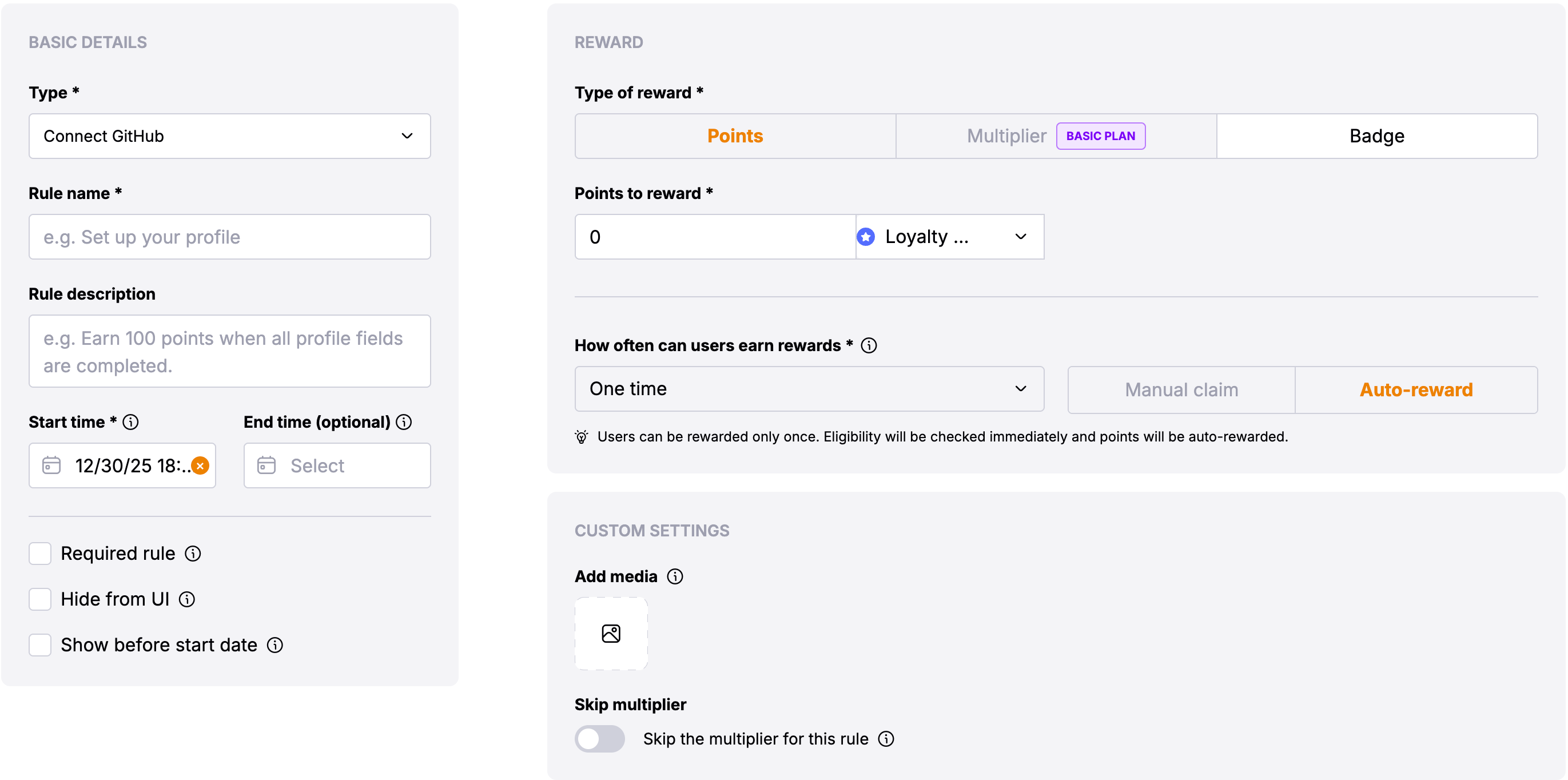 This loyalty rule allows admins to reward users for connecting their GitHub accounts to the platform. This rule encourages users to link their accounts, enabling better community engagement and cross-platform interaction.