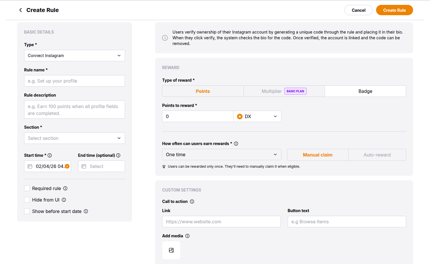 This loyalty rule allows admins to reward users for connecting their Instagram accounts to the platform. This rule encourages users to link their accounts, enabling better community engagement and cross-platform interaction.