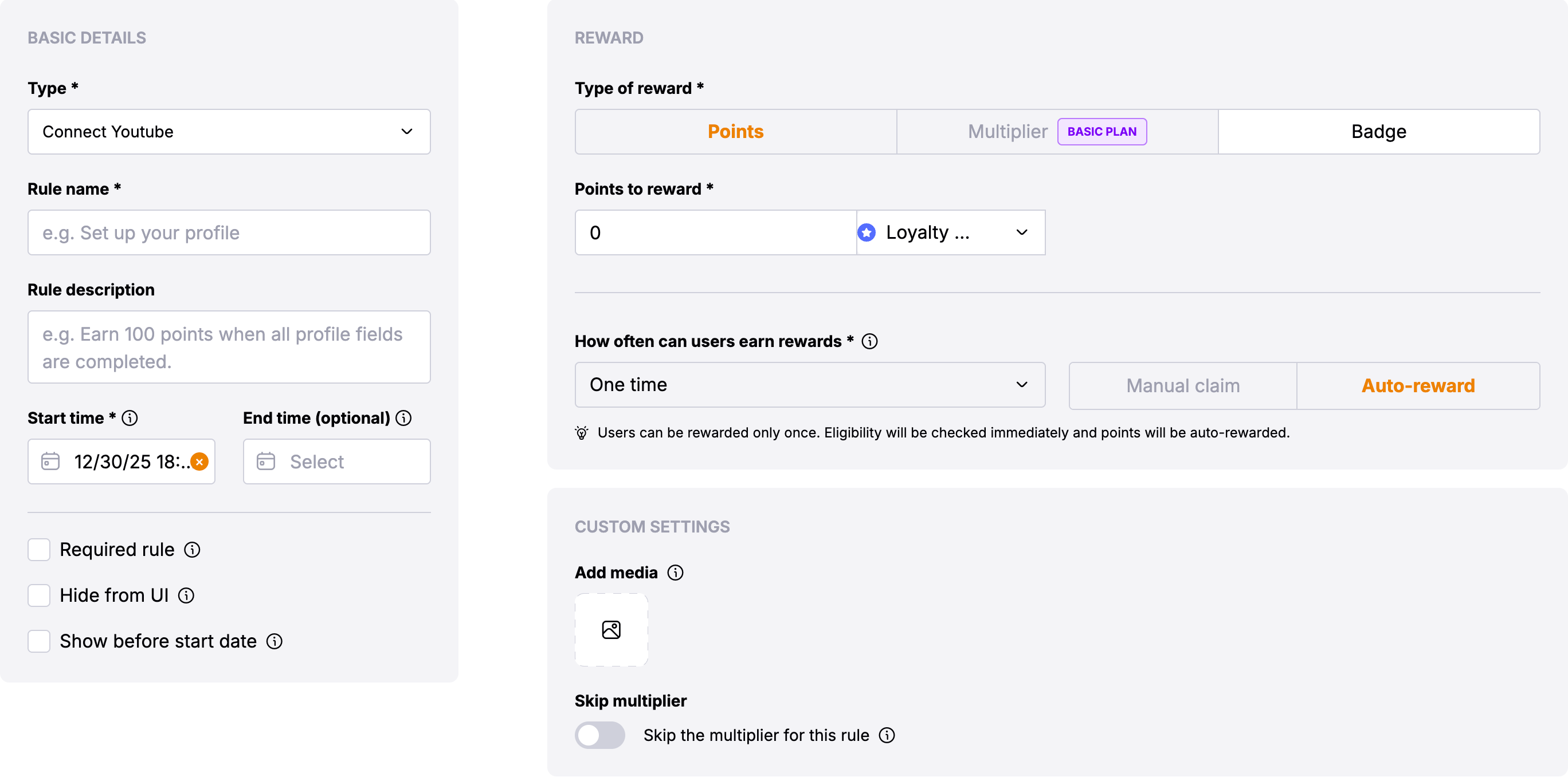 This loyalty rule allows admins to reward users for connecting their YouTube accounts to the platform. This rule encourages users to link their accounts, enabling better community engagement and cross-platform interaction.